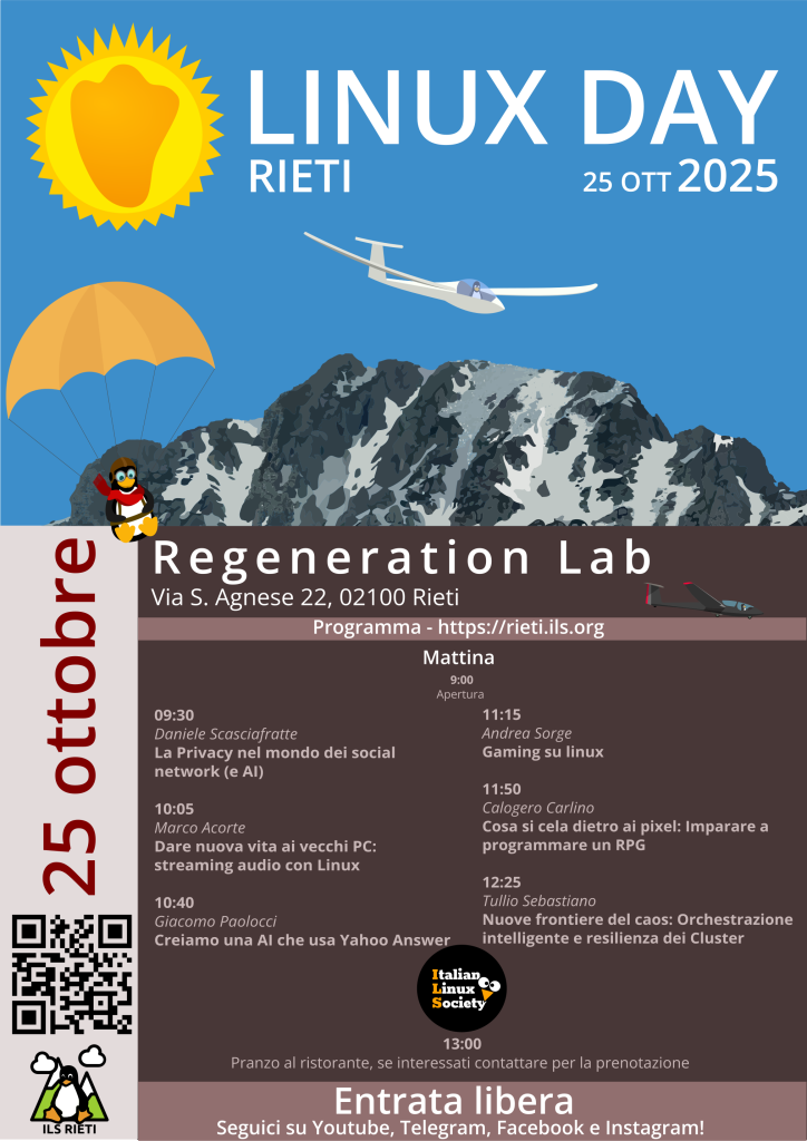 Il 25 Ottobre ci incontriamo tutti quanti per il Linux Day nazionale con un evento aperto a tutti per la sola mattina presso il Regeneration Lab, Via S. Agnese 22 a Rieti (Google Maps o OpenStreetMap).